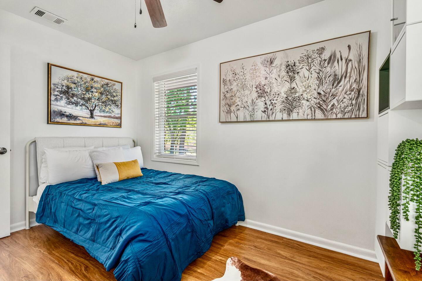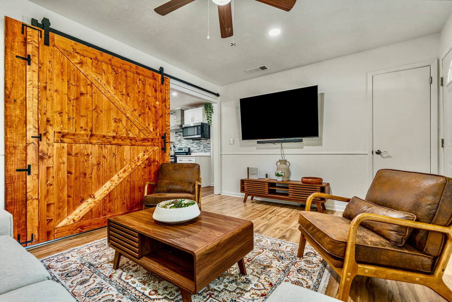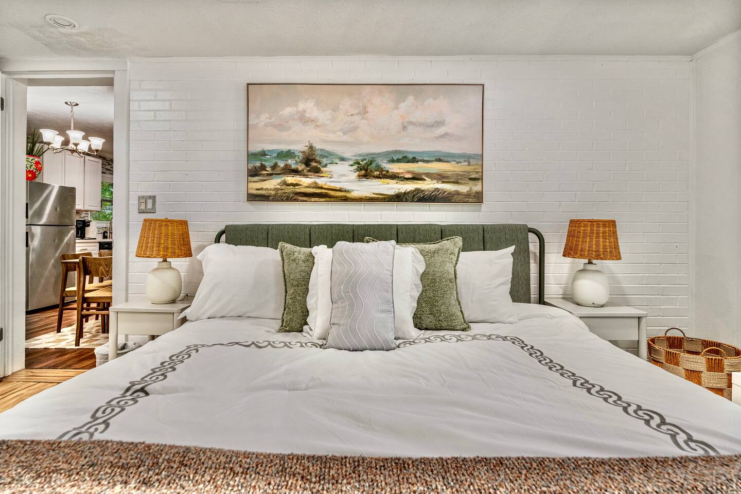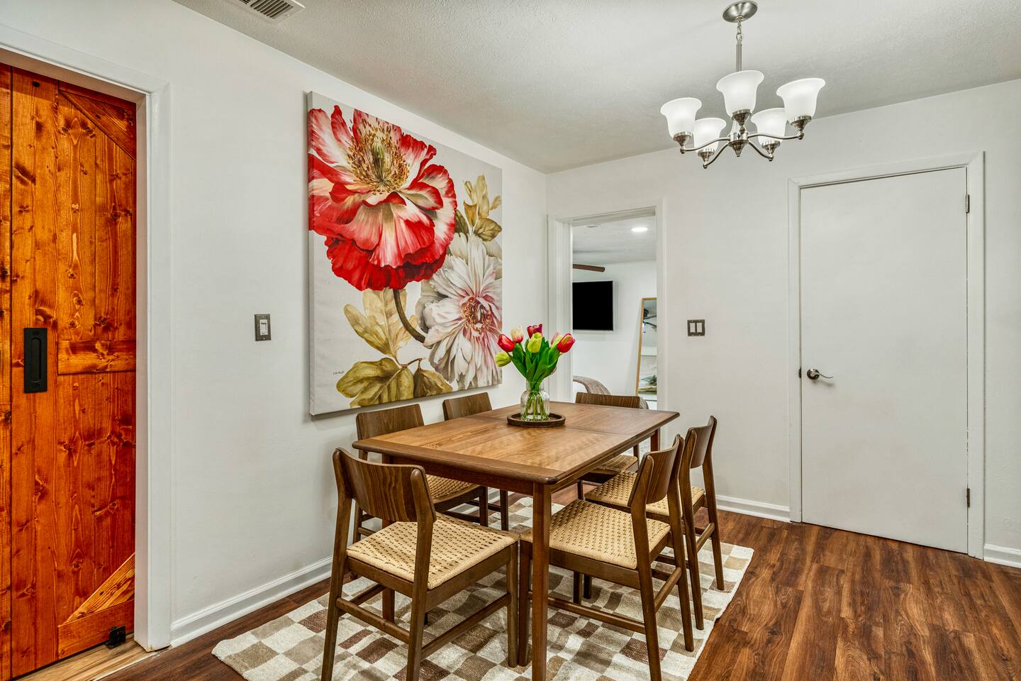 This single story 4-bedroom vacation home includes 2 bathrooms and can host up to 8 guests at a time. As you enter the home, an open living room welcomes you. Have a seat in one of our comfy leather chairs and put on a record to unwind from a long trip. The barn door opens to our fully stocked kitchen. Lots of guests? Our dining table extends to fit a total of eight people. The bench in the white room can be used for additional seating. Right off the dining room, the master bedroom awaits. The king bed and on-suite bathroom are perfect to catch up on some must needed rest. Across the hall, our three other rooms are located. The white room and green room both have queen beds while the blue room is a full bed. Heading outside, you are greeted by our outdoor terrace. Enjoy the indoor/outdoor living with our private dining area with an extendible dining table to fit 8 people. Fire up the grill or take a stroll through our flower garden to our fire pit complete with Adirondack chairs. Whether it’s a large group or a couples escape, Butterfly Bungalow is here to help create new memories. Add our listing to your wishlist by clicking the ❤️ in the upper right-hand corner!