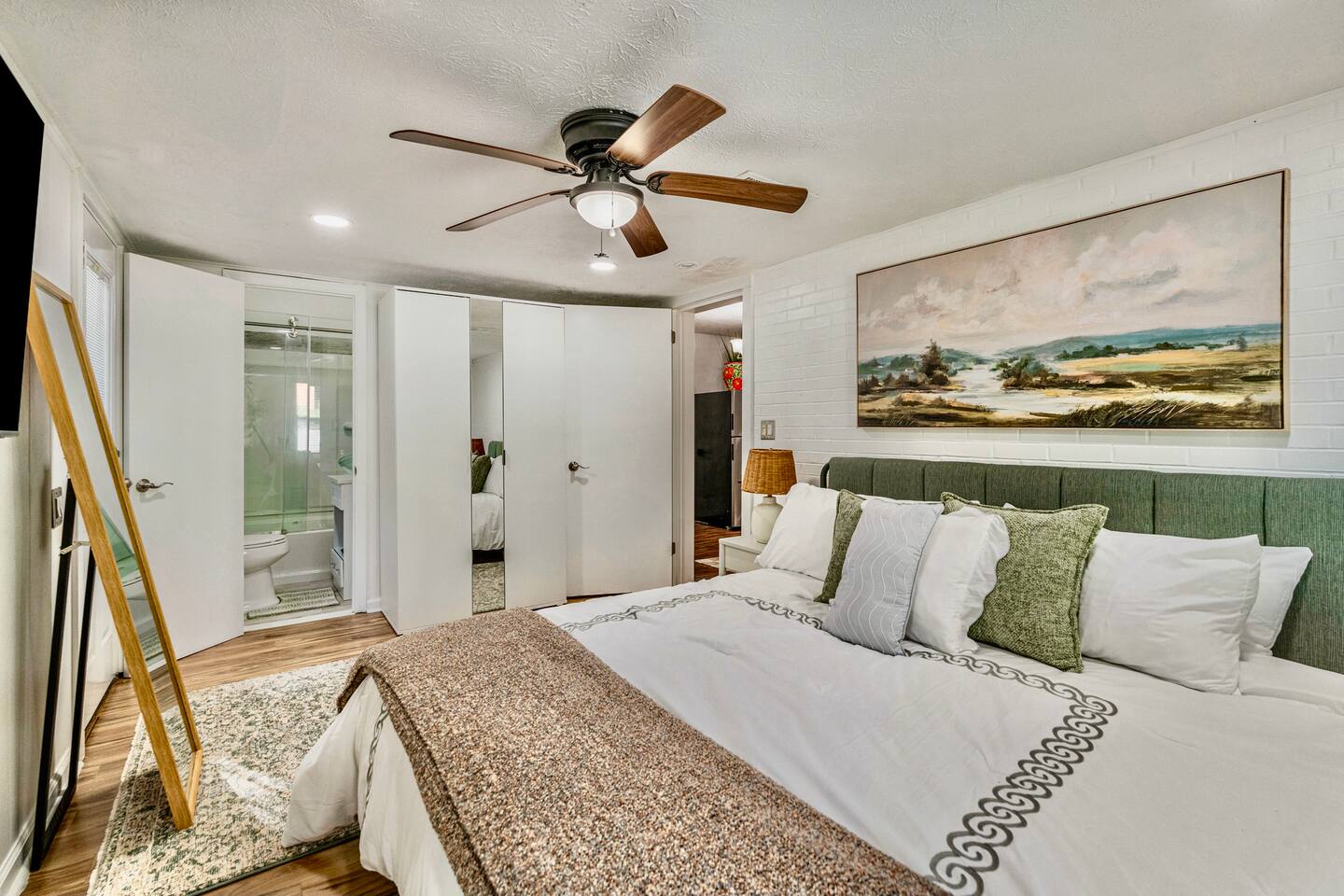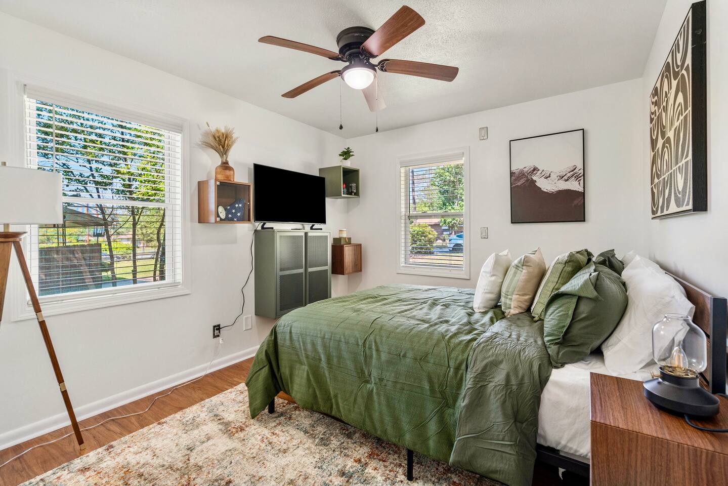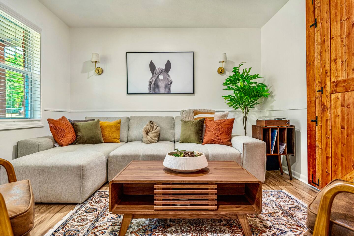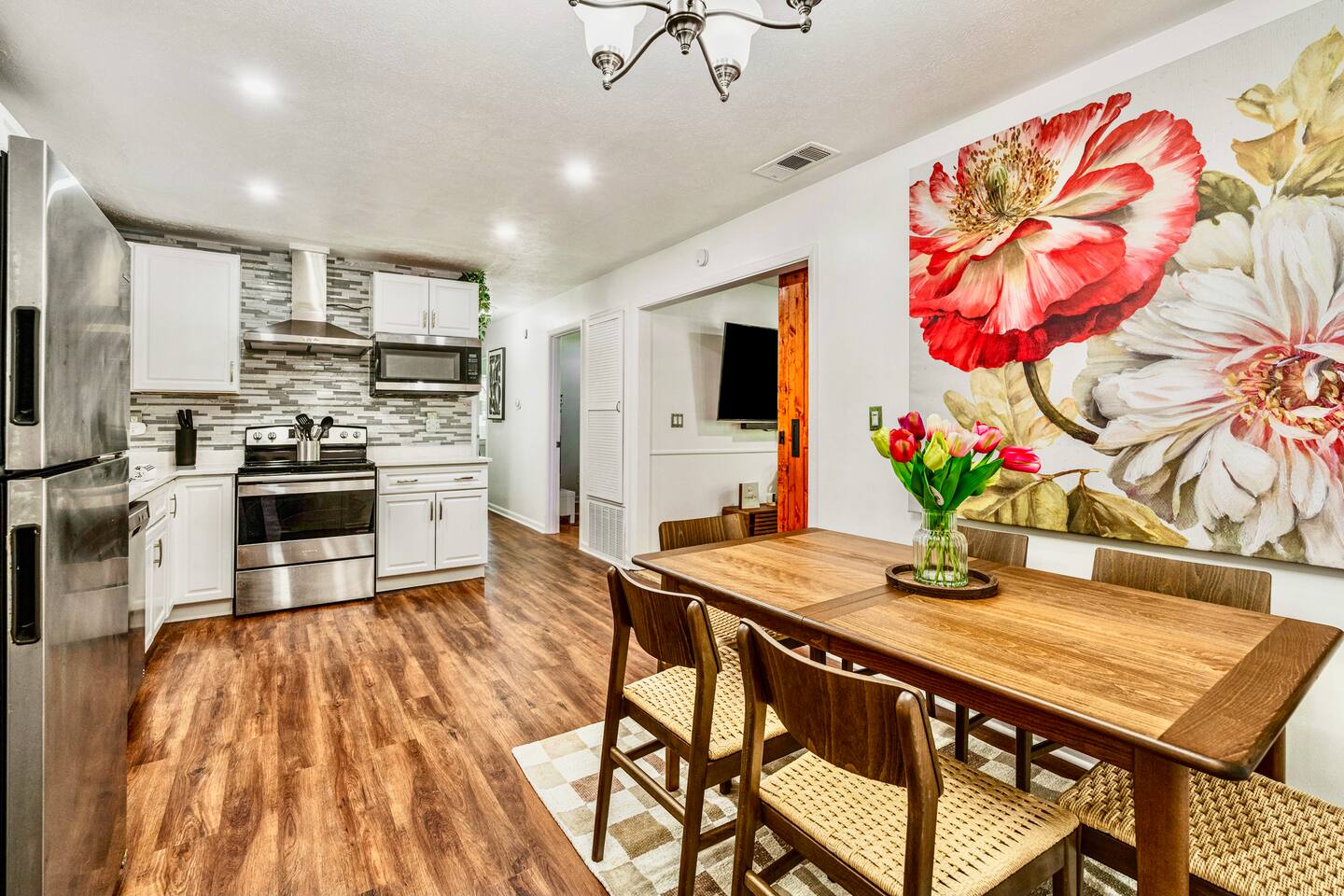 This single story 4-bedroom vacation home includes 2 bathrooms and can host up to 8 guests at a time. As you enter the home, an open living room welcomes you. Have a seat in one of our comfy leather chairs and put on a record to unwind from a long trip. The barn door opens to our fully stocked kitchen. Lots of guests? Our dining table extends to fit a total of eight people. The bench in the white room can be used for additional seating. Right off the dining room, the master bedroom awaits. The king bed and on-suite bathroom are perfect to catch up on some must needed rest. Across the hall, our three other rooms are located. The white room and green room both have queen beds while the blue room is a full bed. Heading outside, you are greeted by our outdoor terrace. Enjoy the indoor/outdoor living with our private dining area with an extendible dining table to fit 8 people. Fire up the grill or take a stroll through our flower garden to our fire pit complete with Adirondack chairs. Whether it’s a large group or a couples escape, Butterfly Bungalow is here to help create new memories. Add our listing to your wishlist by clicking the ❤️ in the upper right-hand corner!