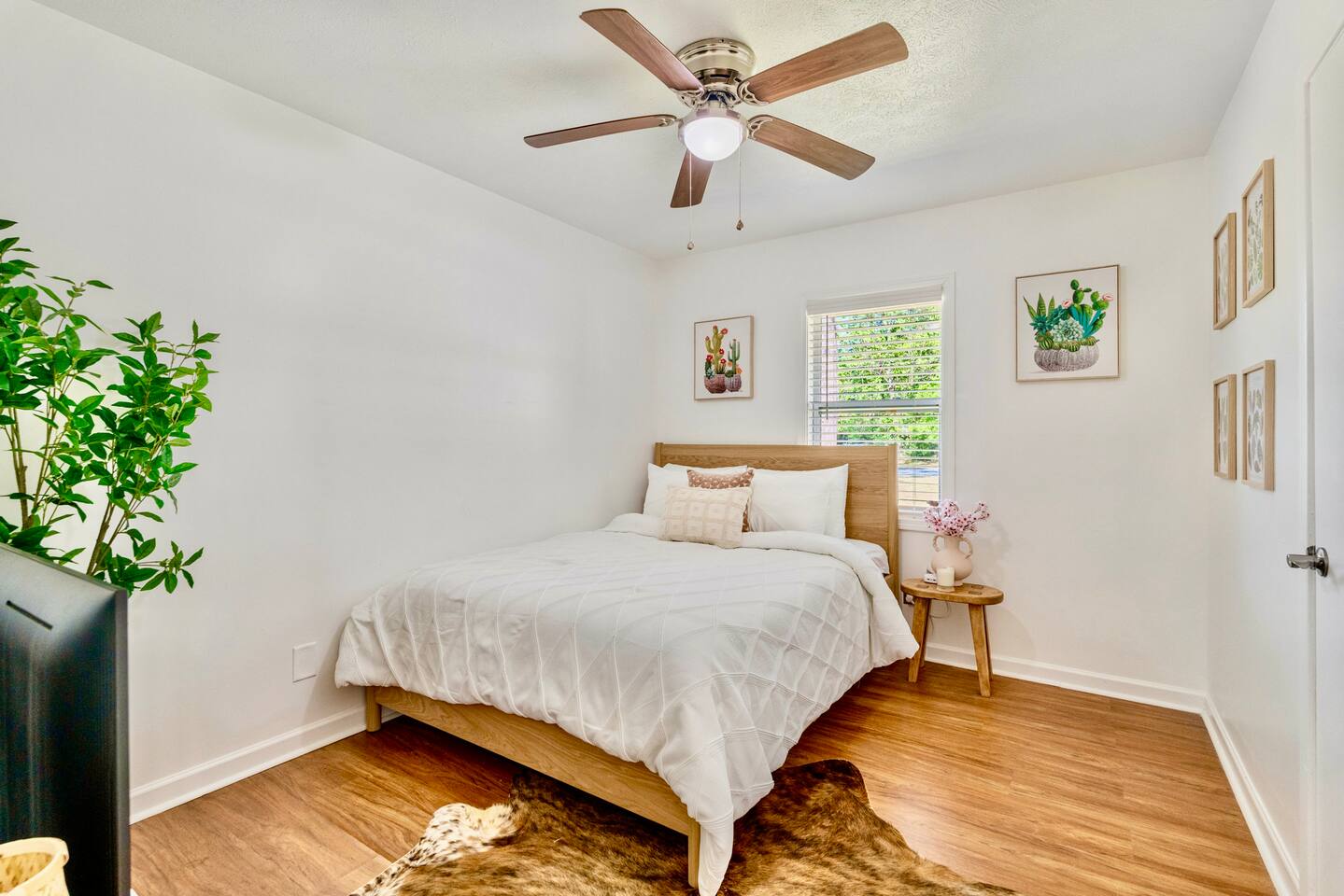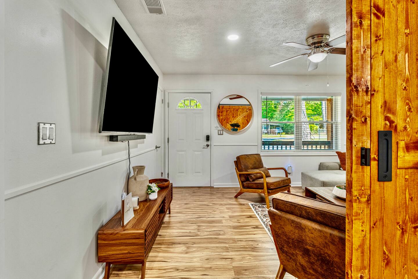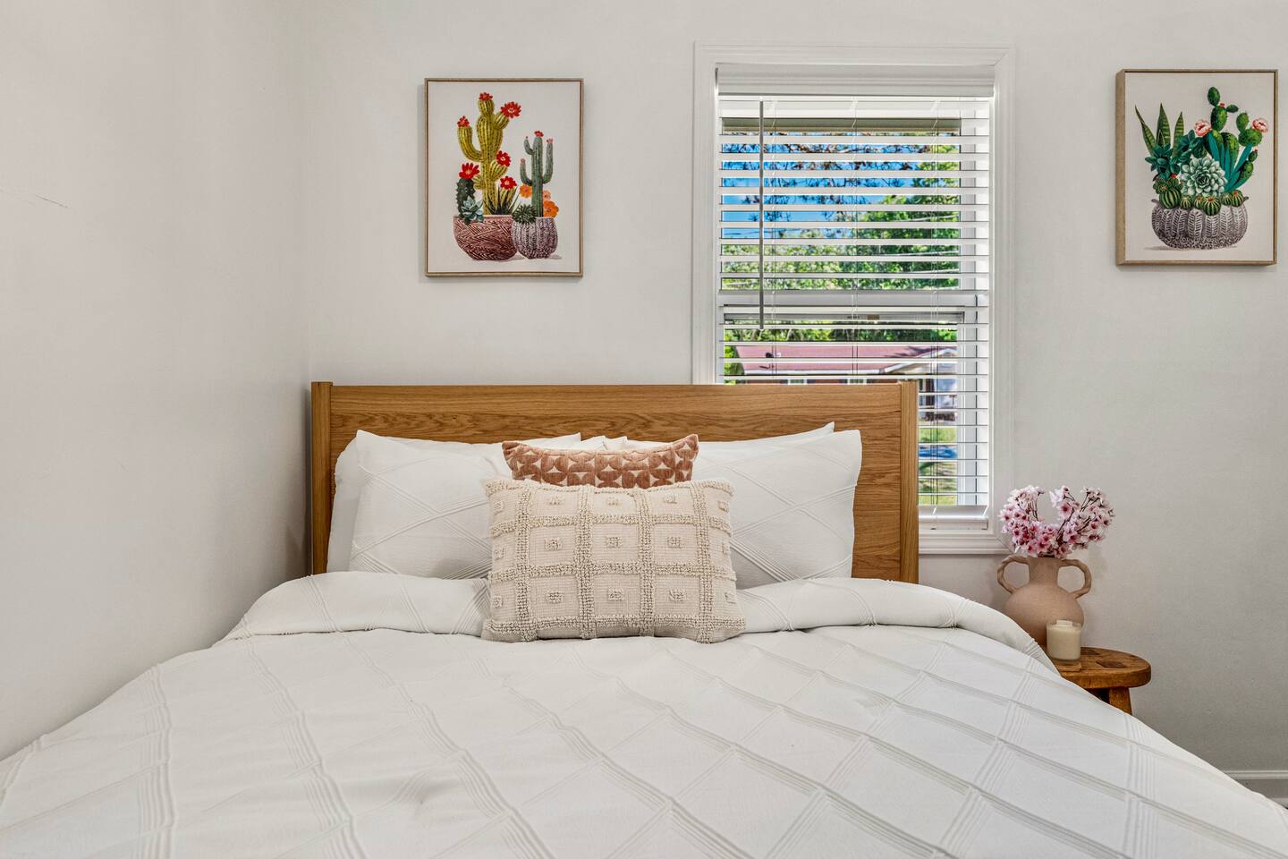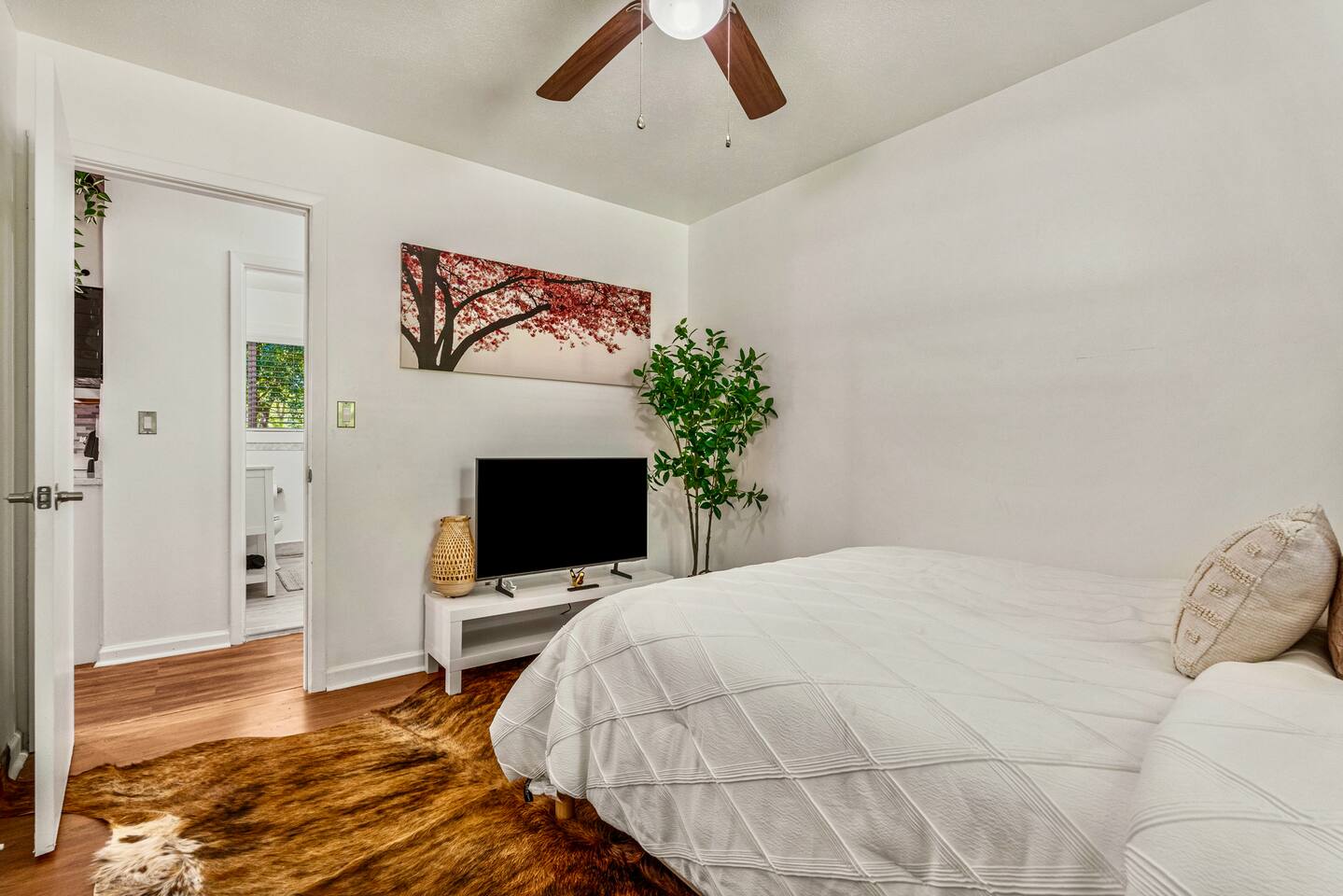 This single story 4-bedroom vacation home includes 2 bathrooms and can host up to 8 guests at a time. As you enter the home, an open living room welcomes you. Have a seat in one of our comfy leather chairs and put on a record to unwind from a long trip. The barn door opens to our fully stocked kitchen. Lots of guests? Our dining table extends to fit a total of eight people. The bench in the white room can be used for additional seating. Right off the dining room, the master bedroom awaits. The king bed and on-suite bathroom are perfect to catch up on some must needed rest. Across the hall, our three other rooms are located. The white room and green room both have queen beds while the blue room is a full bed. Heading outside, you are greeted by our outdoor terrace. Enjoy the indoor/outdoor living with our private dining area with an extendible dining table to fit 8 people. Fire up the grill or take a stroll through our flower garden to our fire pit complete with Adirondack chairs. Whether it’s a large group or a couples escape, Butterfly Bungalow is here to help create new memories. Add our listing to your wishlist by clicking the ❤️ in the upper right-hand corner!