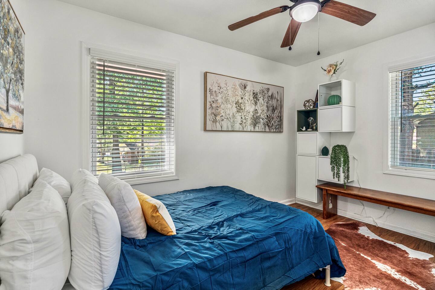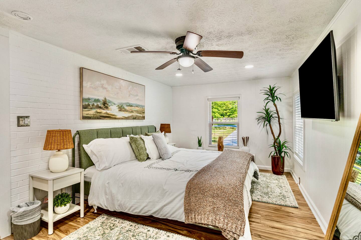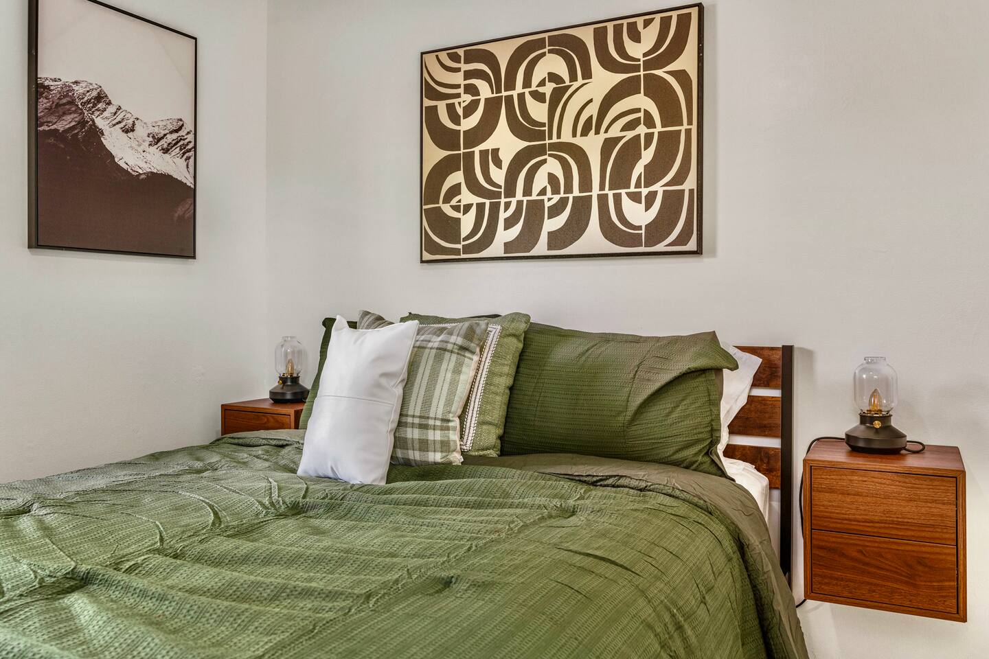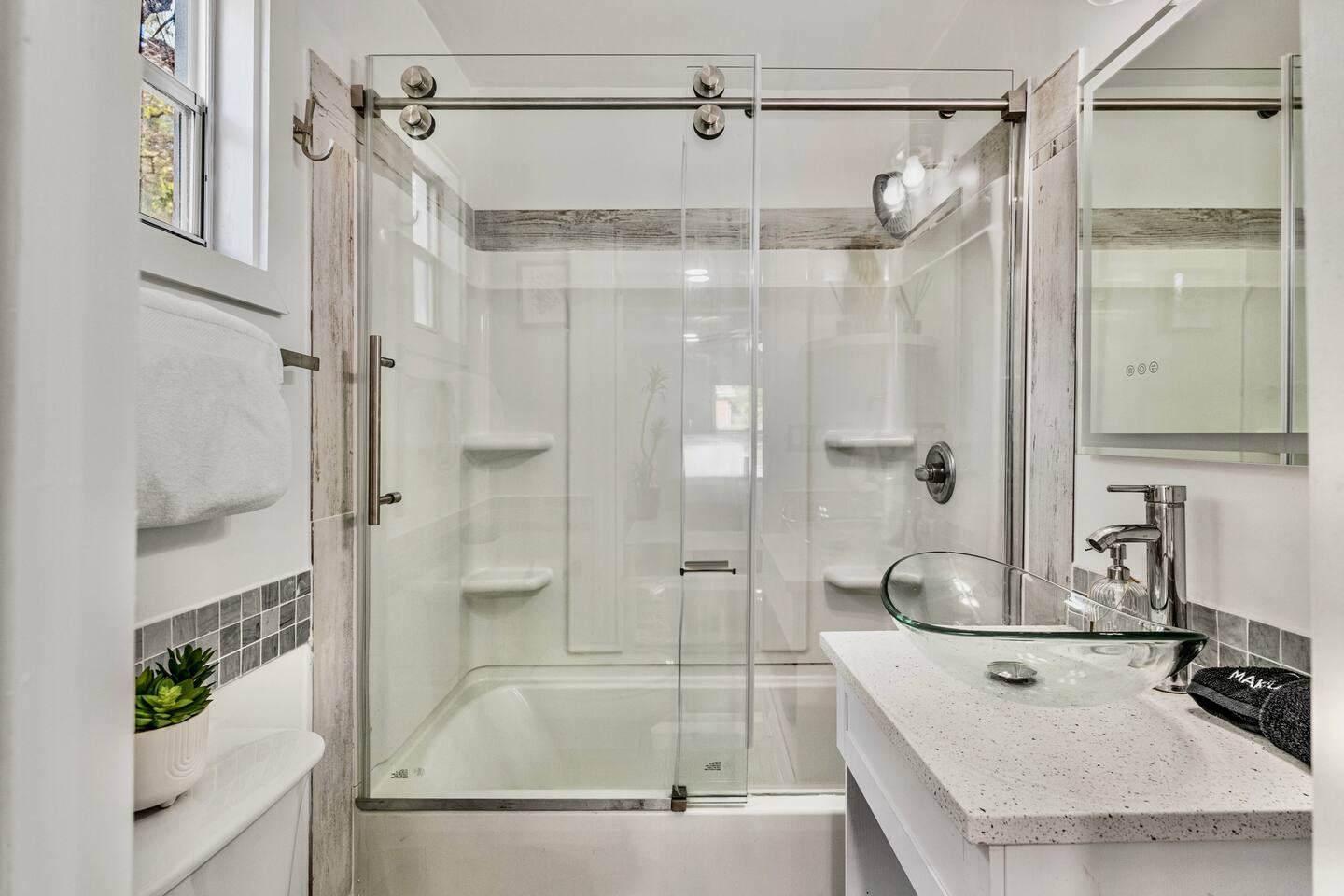 This single story 4-bedroom vacation home includes 2 bathrooms and can host up to 8 guests at a time. As you enter the home, an open living room welcomes you. Have a seat in one of our comfy leather chairs and put on a record to unwind from a long trip. The barn door opens to our fully stocked kitchen. Lots of guests? Our dining table extends to fit a total of eight people. The bench in the white room can be used for additional seating. Right off the dining room, the master bedroom awaits. The king bed and on-suite bathroom are perfect to catch up on some must needed rest. Across the hall, our three other rooms are located. The white room and green room both have queen beds while the blue room is a full bed. Heading outside, you are greeted by our outdoor terrace. Enjoy the indoor/outdoor living with our private dining area with an extendible dining table to fit 8 people. Fire up the grill or take a stroll through our flower garden to our fire pit complete with Adirondack chairs. Whether it’s a large group or a couples escape, Butterfly Bungalow is here to help create new memories. Add our listing to your wishlist by clicking the ❤️ in the upper right-hand corner!